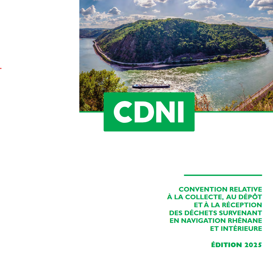 La Convention relative à la collecte, au dépôt et à la réception de déchets en navigation rhénane et intérieure (CDNI) vise à protéger l’environnement et tout particulièrement l’eau. La CDNI est entrée en vigueur le 1er novembre 2009 en Allemagne, Belgique, France, Luxembourg, Pays-Bas et Suisse.